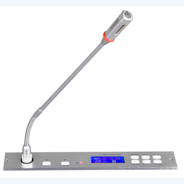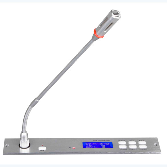 話筒音頭采用最新聲學(xué)研究成果,使用金屬鋁合金四方形結(jié)構(gòu);使得語音更加清晰厚實,頻響寬廣,靈敏度高不易產(chǎn)生嘯叫等特點。 嵌入式安裝會議話筒座,采用鋁合金拉絲工藝,分拆式設(shè)計 話筒具有6個輔助功能鍵和1個開啟/關(guān)閉鍵、 支持1鍵式語言切換,1鍵MUTE靜音和2鍵話筒音量、2鍵喇叭音量控制,按鍵都具有紅色指示發(fā)光,操作直觀,有效防止操作失誤 支持討論及視頻自動跟蹤功能 具有耳機監(jiān)聽功能 具有LED液晶屏顯示并可切換中/英文操作界面