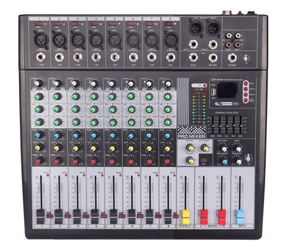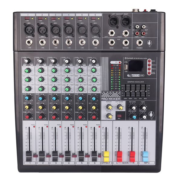 配有XLR和LINE可切換輸入全部通道設(shè)有3段EQ設(shè)有附加效果處理的插入點(diǎn)一條AUX輔助主線輸出內(nèi)置數(shù)碼延時(shí)混音效果器提供可切換的+48V幻像電源平衡/不平衡錄音及回放連接器,兩路單聲道,兩個(gè)立體聲輸入. 三段均衡 內(nèi)置混音效果