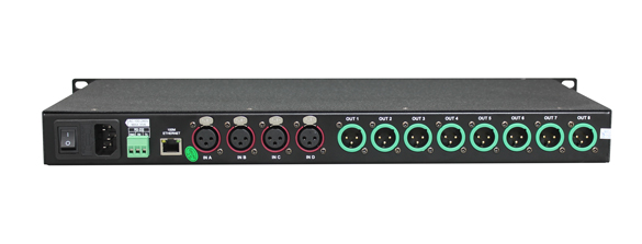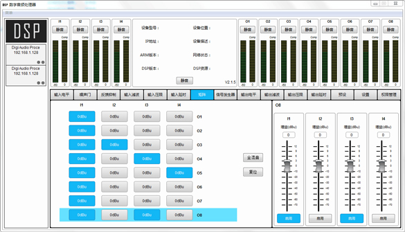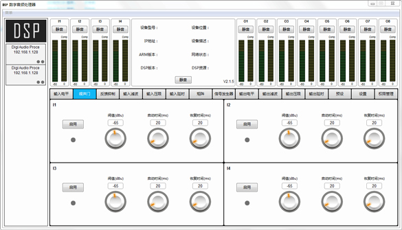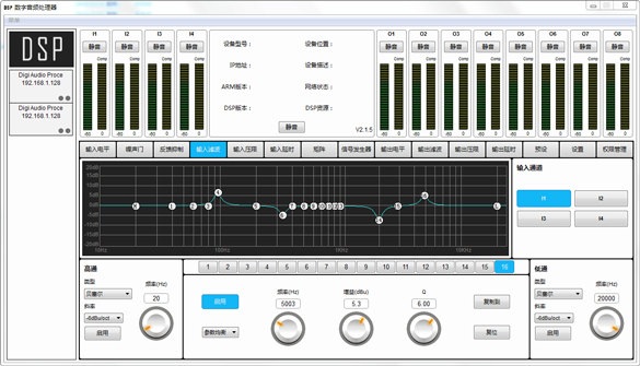 本4進8出的音箱處理器,使用最新的第四代SHARC ADSP-21488 400Mhz浮點DSP,具有強大的DSP處理能力。每個輸入、輸出有16段參數濾波器,增益控制、噪聲門功能、RMS壓限、內置的粉紅/白噪聲發生器,以及可調的延時。分頻器的斜率從6dB/Oct48dB/Oct范圍內可選。延時步進精度0.02ms,電平增益精度0.1dBu,滿足現場精細調節。AD-DA動態范圍114dBu。系統動態范圍110dBu。每個輸入通道包含噪聲門,反饋抑制器,壓限器。100M以太網接口。PC軟件自動發現處理器。32種系統預設。通道參數快速拷貝。 ■可通過以太網升級DSP、ARM固件。 ■最大輸入電平 18dBu;最大輸出電平 18dBu;默認輸出電平 0dBu。 ■諧波失真THD+N <0.003%;1kHz@+4dBu<0.0035%;1kHz@+10dBm;<0.0035%;20Hz~20kHz@+4dBu。 ■頻率響應 20Hz-20kHz, +/-0.2dB。 ■輸入到輸出動態范圍 110dB (無記權);信噪比 -110dB (無記權。 ■ADC動態范圍 CS5361 114dB;DAC動態范圍 CS4382A 114dB。 ■DSP 400Mhz浮點 SHARC ADSP-21488。 ■采樣頻率 48K;量化 24Bit;模式存儲 32。 ■壓限器 前后獨立共12個: 延時器 輸出1-4 218ms。