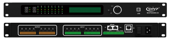 MAP0808M-D4是一款8進(jìn)8出的自動(dòng)混音媒體矩陣,配備8路模擬輸入和8路模擬輸出,內(nèi)置反饋抑制,自動(dòng)混音,矩陣混音,均衡器,分配器,壓縮器等DSP功能,支持Dante網(wǎng)絡(luò)音頻功能擴(kuò)展,通過(guò)USB免驅(qū)連接電腦軟件控制,RS232,TCP/IP連接中控遠(yuǎn)程控制,適合用在各種場(chǎng)合的擴(kuò)音工程。 ■4路Dante網(wǎng)絡(luò)數(shù)字音頻輸入,4路Dante數(shù)字音頻經(jīng)DSP處理后輸出 ■8路模擬音頻輸入8路模擬音頻輸出,支持麥克風(fēng)輸入和線路輸入自由切換 ■Dante網(wǎng)絡(luò)數(shù)字音頻與模擬音頻可自由切換 ■每路輸入帶48V幻象電源,可以上位機(jī)軟件開(kāi)關(guān)控制 ■模擬音頻每路輸入帶反饋抑制功能開(kāi)關(guān),兩檔調(diào)節(jié) ■帶自動(dòng)混音和矩陣混音功能 ■帶攝像跟蹤功能 ■輸入31段PEQ可調(diào),輸出10段PEQ可調(diào) ■USB免驅(qū)自動(dòng)連接軟件,支持TCPIP多臺(tái)機(jī)器集中管理調(diào)試,配置RS232/RS485中控控制接口,GPIO外擴(kuò)控制接口