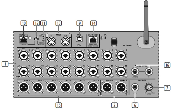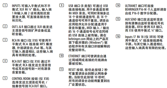 ■革命性的XR18擁有18路輸入和12路混音母線,我們將XR18的一切零部件集中安置在一個便攜式的堅固機架里面,只需使用iPad和Android平板電腦就能控制它。XR18非常適合于現(xiàn)場擴聲和錄音工作室,它擁有16個MIDAS設計的頂級麥克風前置放大器,內(nèi)置了無線路由模塊用于無線遙控,此外我們還為XR18配置了一張雙向傳輸?shù)腢SB音頻接口。 ■18路,12母線數(shù)字處理器,針對IPAD和安卓平板設計。配有16個可編程MIDAS前置放大器,內(nèi)置wifi模塊和多通道USB音頻接口。您只需在iOS,Android和PC端裝上應用程序就可以在錄音棚或者會場里面自由移動和控制所有的參數(shù),自由的混音。它幾乎適用于任何擴聲場合。無論是MIDAS前置放大器,自動混音功能,還是免費的多軌錄音,都讓這張調(diào)音臺顯得價值千金。專業(yè)音頻設備的發(fā)展,應該盡可能的讓操作變得簡單,“傻瓜式”,這樣可以讓用戶獲得最舒暢的體驗和服務。 ■內(nèi)置三種模式的無線路由器:為了達到最佳的流動性,我們?yōu)閄R18內(nèi)嵌了一個集成的無線路由模塊。通過這個模塊,你可以直接無線遙控調(diào)音臺,無需另外配置和安裝一個外部路由器。XR18在混音上面給你更多的自由,你可以移動到擴聲區(qū)域的每個角落去聆聽現(xiàn)場的聲音。此外,你可以站在藝術家的角度去修飾現(xiàn)場的舞臺監(jiān)聽,更妙的是,你還可以讓藝術家們通過自己的移動終端混合自己的無線監(jiān)聽或者監(jiān)聽音箱。 1.訪問點接入是連接4種控制終端最簡單的方法(iPad、安卓手機,平板電腦、筆記本電腦)這種模式需先開啟你的無線控制終端,并讓 它運行最少一分鐘以上; 2.無線連接端允許你的處理器與在同一網(wǎng)絡的其他無線控制終端連接在一起; 3.此外,你還可以直接通過網(wǎng)線連接到你的電腦,或者連接一個專用的無線路由器,讓無線頻帶更寬,距離更遠。 ■錄音更簡單:XR18標配了超低延時的18x18雙向多通道USB音頻接口,使之成為無比強大的數(shù)字混音和數(shù)字錄音調(diào)音臺。當輸送16路話筒信號和鍵盤手的MIDI信號進數(shù)字音頻工作站時,你可以通過電平表監(jiān)視各路的信號,將它們完美的混合在一起,所有的操作近乎零延時。那些在錄音棚、排練室、舞臺上的搖滾歲月,你可曾想把它們記錄下來?有了XR18,這一切將可變成無比清晰的記憶! ■革命性的自動混音技術:在一些特定的場合,如座談會、新聞發(fā)布會或者法庭的審訊,往往需要同時使用多個話筒,并且保持主席話筒的優(yōu)先地位,作為此款處理器的革新技術之一,X AIR 的增益共享技術能管理多達16個話筒。采用Dan Dugan自動混音系統(tǒng),XR18 的增益共享技術能實時自動調(diào)控所有連接話筒的電平,無須任何額外的操作。 ■Xr18實現(xiàn)自動混音:以往同時使用2個或以上話筒時,反饋噪聲、錄音噪聲和濾波器噪音問題使人備受困擾,而XR18增益共享技術則能使你從此遠離這些煩惱。此技術為系統(tǒng)增益結構持續(xù)護航,,即使多人同時使用話筒講話,也能使系統(tǒng)處于平穩(wěn)狀態(tài)。4個機載X32效果器